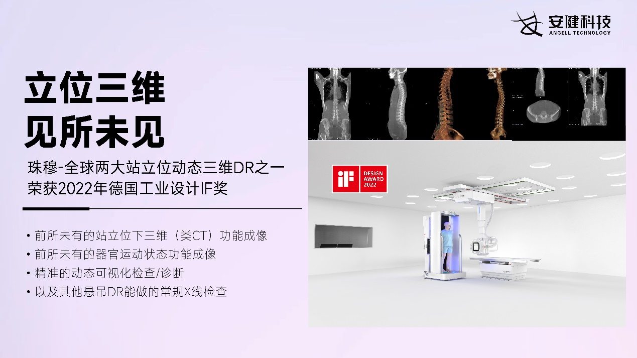 作為全球領(lǐng)先的三維懸吊動態(tài)數(shù)字化X線攝影系統(tǒng),珠穆在2022年德國漢諾威工業(yè)設(shè)計論壇中榮獲設(shè)計大獎(IF獎),憑借著簡潔實用的結(jié)構(gòu)與功能設(shè)計,珠穆可以實現(xiàn)多種模態(tài)下的X線攝影檢查,包括一站式的二維檢查與三維檢查;器官運動功能成像檢查;動態(tài)可視化檢查;全脊柱/全下肢檢查等,是全球懸吊式X線攝影系統(tǒng)中的創(chuàng)新佼佼者。