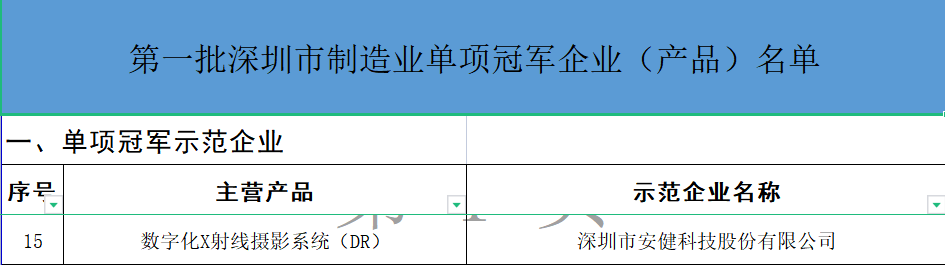 2023年1月6日,深圳市工業(yè)和信息化局公布《第一批深圳市制造業(yè)單項(xiàng)冠軍企業(yè)(產(chǎn)品)名單》,安健科技憑借在數(shù)字化X射線攝影系統(tǒng)(DR)領(lǐng)域的技術(shù)創(chuàng)新與領(lǐng)先的市場(chǎng)占有,獲評(píng)深圳市單項(xiàng)冠軍示范企業(yè)。