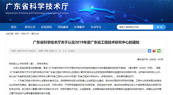 廣東省科學(xué)技術(shù)廳認(rèn)定安健科技為廣東省工程技術(shù)研究中心